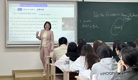石旺君老师围绕文章《The Dead》,用演绎法和归纳法对文章的主题进行梳理,帮助学生更好的理解英语文学作品的音律之美、意象之美、修辞之美和意蕴之美。学生代表听课后表示:“石老师聚焦于作品所揭示的人性和情感的复杂性。通过对人物关系、情感冲突以及象征主题的探讨,石老师阐述了作品所传达的核心思想。”