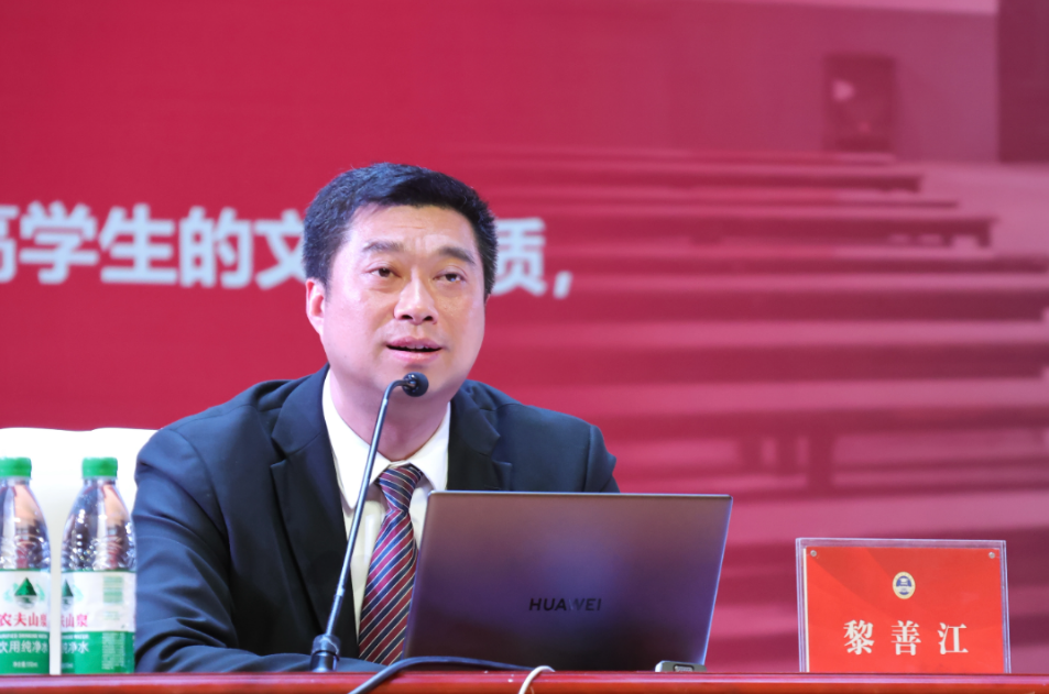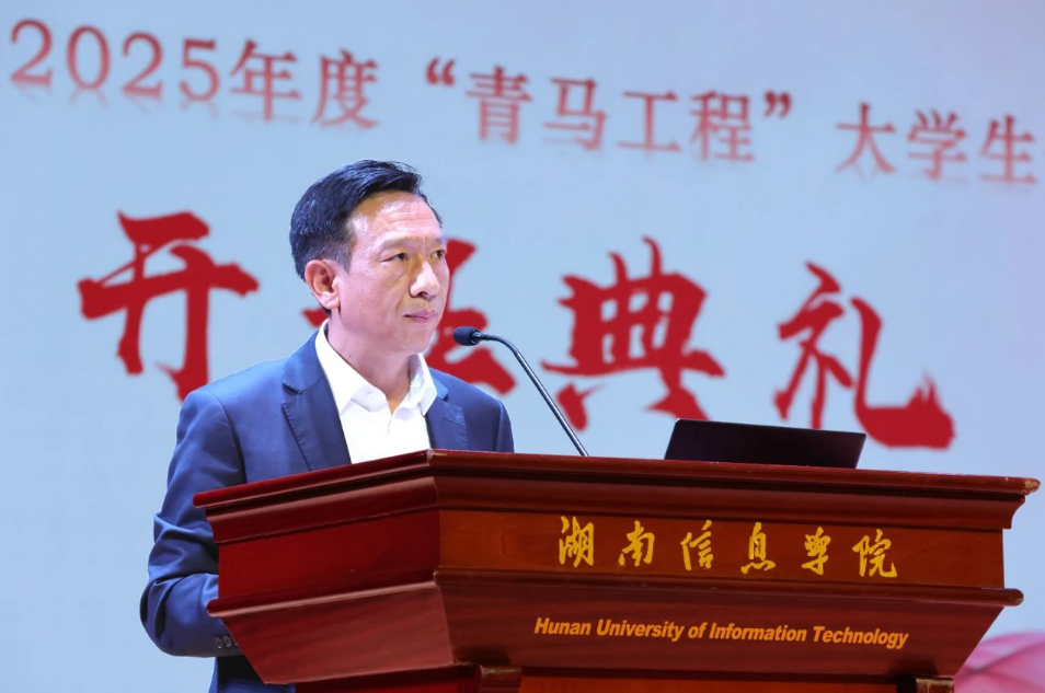 仪式结束后,校党委委员、学生工作部部长、校团委书记黎善江以《新时代湘信青年的挺膺担当》为题讲授开班第一课。他紧扣“倾情爱国立志做大事,忠心报国勤学长本事,投身强国勇敢担难事”三条主线,以李子柒扎根乡土、文化自信助力乡村振兴的奋斗故事为例,生动阐释新时代青年如何立足自身、胸怀家国,将个人理想融入国家发展大局。他号召学员以“立大志”锚定人生坐标,以“练硬功”锻造核心能力,以“担重任”彰显青春本色,在强国建设的火热实践中勇当先锋、敢为闯将,用行动诠释“请党放心,强国有我”的铮铮誓言。