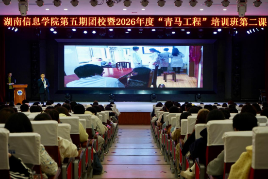 4月12日晚,湖南信息学院国际会议中心,第五期团校暨2026年度“青马工程”大学生骨干培训班第二课开讲。“中国好人”“湖南省道德模范”唐林老师应邀作专题授课,以“平凡之路”为主题,分享他辞去公职、投身慈善14年的真实经历。